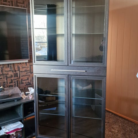 Selger IKEA Anderssen & Voll vitrineskap med glassdører og hvite underskap. (IKKE VARENE INNI!) Møbelet har flere hyller for oppbevaring og visning av gjenstander. Designet av Anderssen & Voll for IKEA.