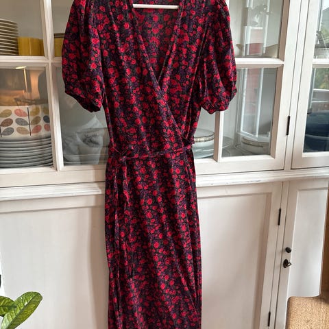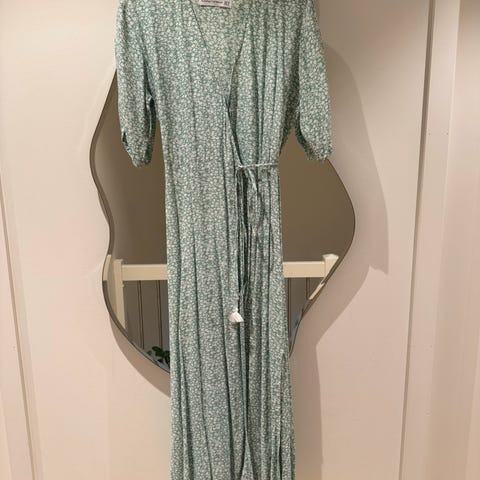 Nydelig omslagskjole med tidløst polkadot mønster. Kjolen har v-utringing, knyting i livet og korte ballongermer. Rekker til over kneet. Kjolen er laget av 100% lin. Normal på størrelsen. Brukt 2 ganger, er som ny.