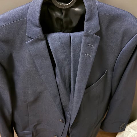 Mørk blå Mario Conti-dressjakke i klassisk snitt. Pent brukt, men trenger nok litt rengjøring/rens etter noen år hengende i skapet. Selges derfor billig.