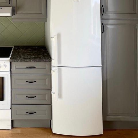 Samsung kombiskap . Høyde 178 cm bredde 59, cm ,dybde 64 cm ,😀litt skjønnhetsfeil her og der ( se bilder) men MYE bruk igjen . Vi selger fordi vi monterer nytt kjøkken . Kjøledørene har sensorer som sier i fra når du må lukke .Mye plass i både fryser og kjøledelen. Må hentes på isebakke/Halden 😀