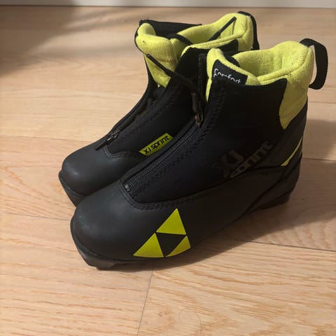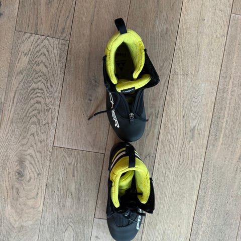 Fischer skisko med glidelås foran. Designet for å gi støtte og komfort under skigåing. Fargen er hovedsakelig svart med hvite og gule detaljer.