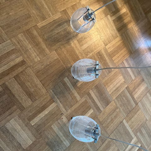 Fin taklampe. Passer godt over spisebordet. Pærene gir et fint lys. Vi kjøpte lampen på finn og byttet ut pærene som var i fra før, så disse er ikke så veldig mye brukt.