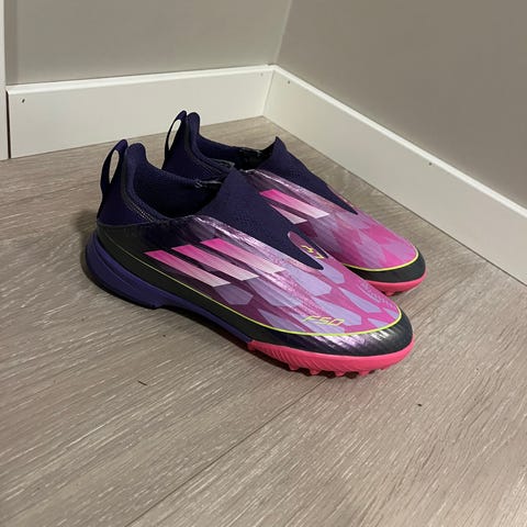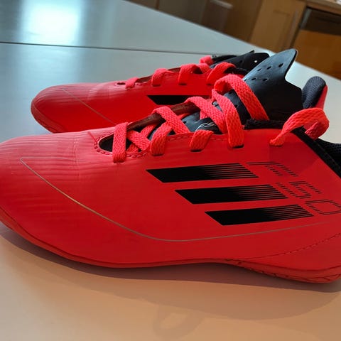 Adidas Sala innendørs fotballsko i størrelse 31. Skoene har en hvit overflate med blå detaljer og gule lisser og såle. Designet for innendørs bruk med gummisåle for godt grep.