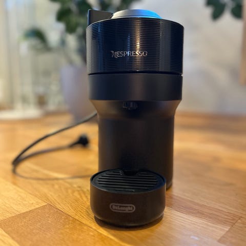 Nespresso Pixie kapselkaffemaskin i svart farge. Maskinen har et kompakt design med metallsidepaneler og et avtakbart vannreservoar. Egnet for enkel tilberedning av espresso og kaffe ved bruk av Nespresso-kapsler.