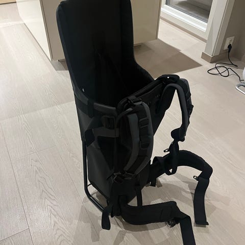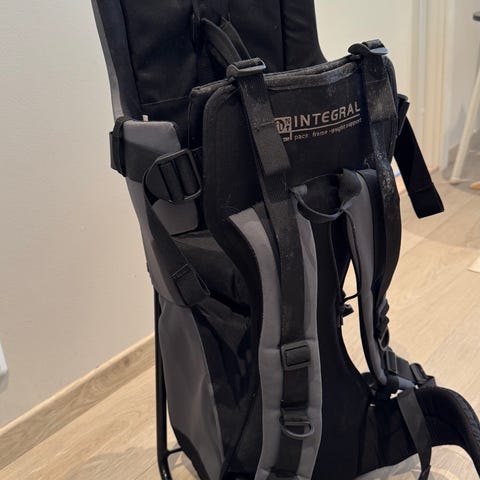 Integra bæresystem for barn i grå farge. Designet for å bære barn på ryggen med justerbare stropper og polstret ryggstøtte for komfort. Egnet for utendørs bruk og turer.