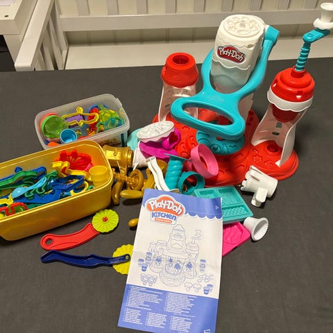 Play-Doh barneleketøy med ulike former og tilbehør for å lage og leke. Inkluderer former, skjeer og i plastmateriale. Passer for barn som liker kreativ lek og forming.