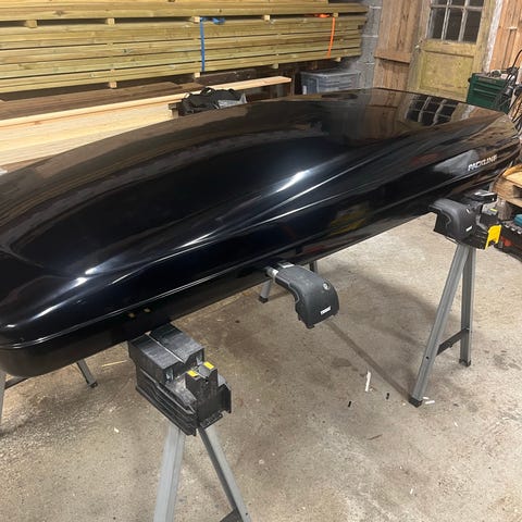 Packline takboks i svart farge. Dette er tunneltype slik at bøylene er skjult inne i boksen. Dette gjør at boksen kommer veldig nært taket og får ett penere utseende. Står på Thule Wingbar bøyler.