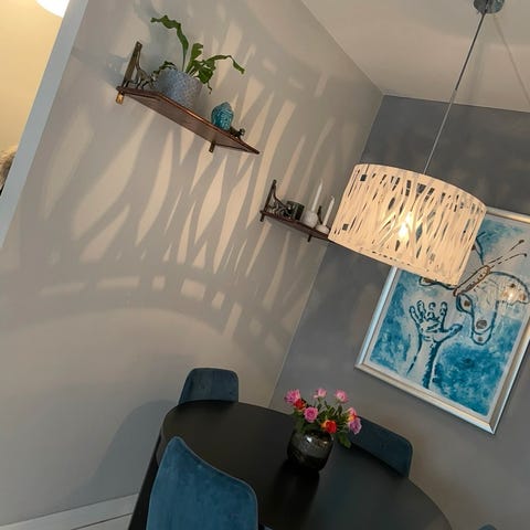 Lampeskjerm i sotet glass med lampeledning selges. Det er mulig å bytte ut lampeledningen. Diameter ca 30 cm, høyde ca 27 uten lampeledningen