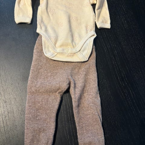 Lindex ullbody og -bukse i størrelse 62, beige farge, unisex design. Laget av 100 % ull. Settet består av en langermet body og matchende bukse.