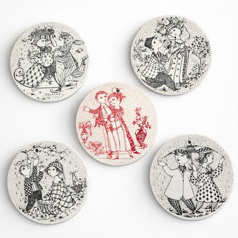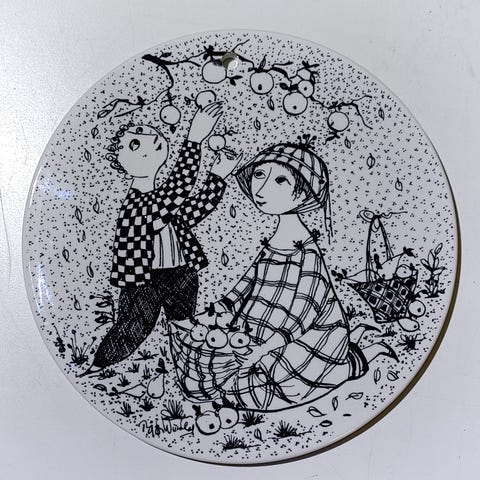 En strøken veggplatte i porselen fra kjærlighets-serien til Bjørn Wiinblad, produsert av Nymölle. Denne har tittelen «Harmoni» og er nr fem i en serie på tolv. Det finnes ulike motiver for alle kalenderens måneder.