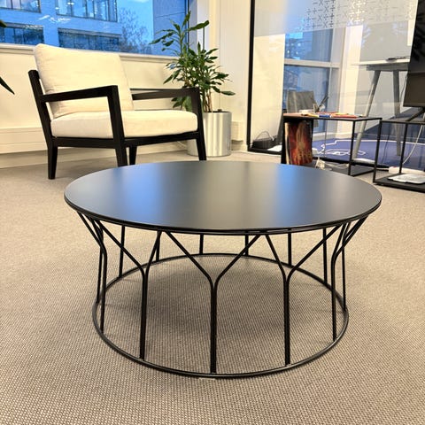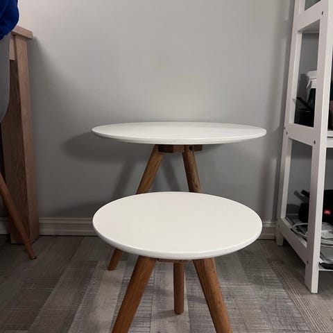Selger to runde bord / hjørnebord. Lite bruksmerker på toppen men ellers helt fin. Den største er 140 cm rund og 49 cm høy og den lille er er 109 cm rund og 39 cm høy.