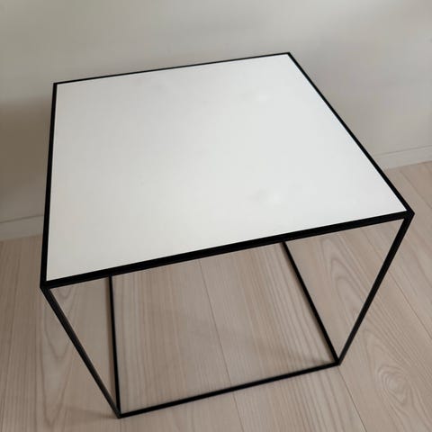 Arne Jacobsen sofabord i hvit farge. Bordet har en firkantet form og er laget for bruk i stue eller oppholdsrom.