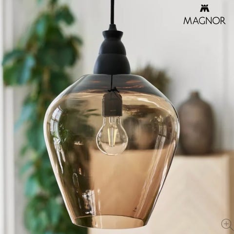 Kjempekul taklampe i lyst treverk.