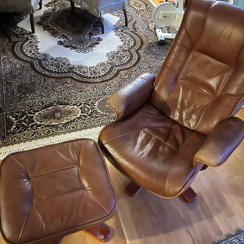 Lenestol med tilhørende fotskammel i beige stoff. Stolen har trearmstøtter og en polstret sitteflate og rygg. Kan reguleres, legges bakover.