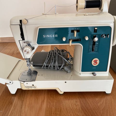 Singer symaskin med tilbehør og oppbevaringskoffert.