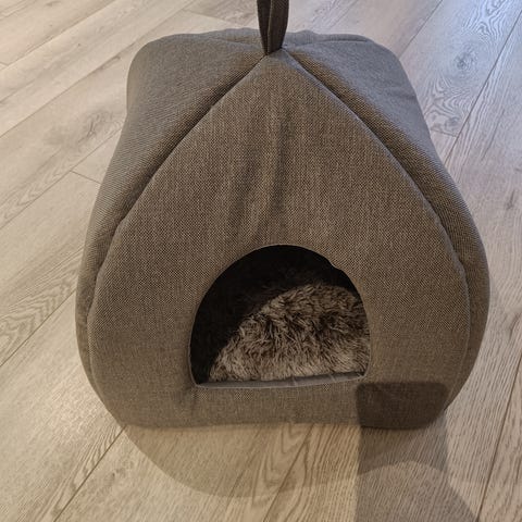Tiaki Cova dobbel hevet skål for kjæledyr med to rustfrie stålkopper. Skålen er designet for å gi en komfortabel spisehøyde for kjæledyr, noe som kan bidra til bedre fordøyelse og redusert belastning på nakke og rygg. Materialet består av rustfritt stål og et underlag i plast med ben for stabilitet.