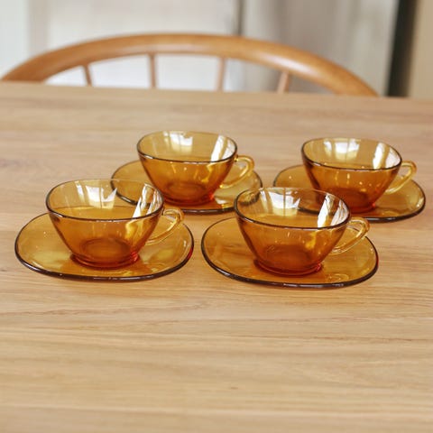 Veldig fine kaffekopper i gul / okergul farge og fat i mørke sjøgrønt.
