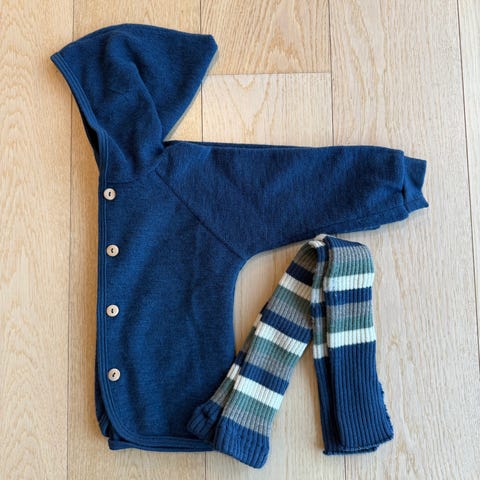 Nøstebarn ull heldress i størrelse 104, farge grå. Ikke tovet, vasket med Nøstebarn vaskemiddel. Dyrefritt og duftsvakt hjem.