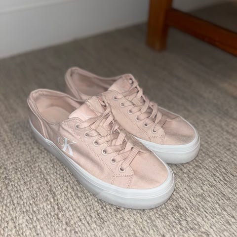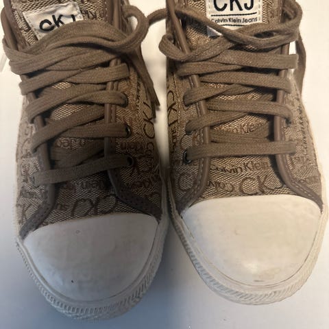 Calvin Klein Sneakers joggesko i størrelse 37. Skoene er hvite med beige detaljer og har en gummisåle. Designet for daglig bruk og casual aktiviteter.