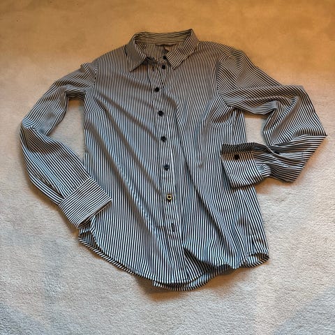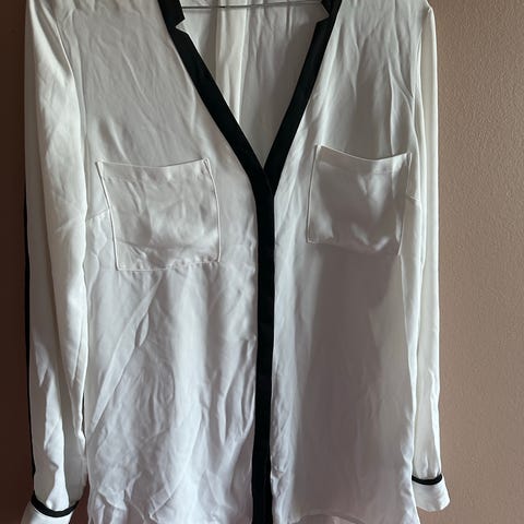 Hvit med enkel knappe lukking foran og «jukse lomme»