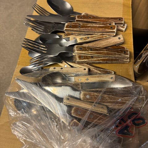 Enkelt IKEA bestikksett i rustfritt stål som inkluderer kniver, gafler, spiseskjeer, teskjeer og mindre gafler og skjeer.
