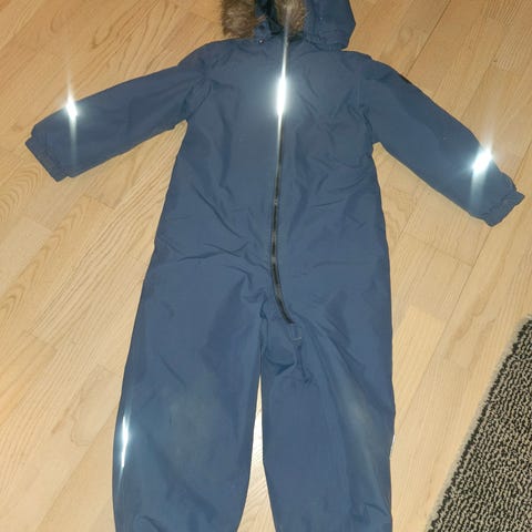Name it Play Tech vinterdress. Mørkeblå (jeans-lignende tekstur). Avtakbar hette, justerbare fotstrikker, og reflekterende detaljer.