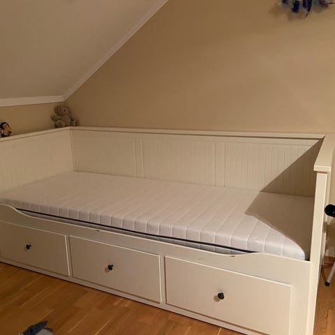 IKEA Hemnes hvit med oppbevaringsskuffer. Trekkes lett ut til dobbeltseng. 2 madrasser i 80cm bredde følger med. Noen bruksmerker, men mye bruk igjen..