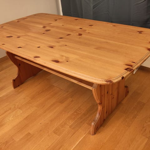 Hjørnebord kjøpt for 20 år siden. Laget av rik og glass.