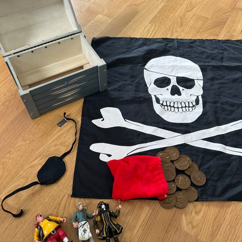 Flagg, pistol og figur med fakkel og lyd.