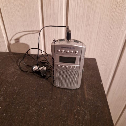 Grundig radio i fargene sølv og svart. Kompakt design med flere funksjonsknapper på siden og volumkontroll. Utstyrt med strømkabel og hodetelefonutgang.