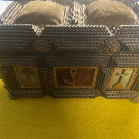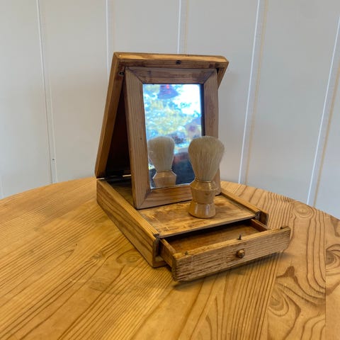 Antikk sminkebord i tre med stort speil og flere skuffer. Møbelet har dekorative detaljer og en naturlig trefinish. Passer til oppbevaring av sminke og småting. Noen mangler. Se bilde.