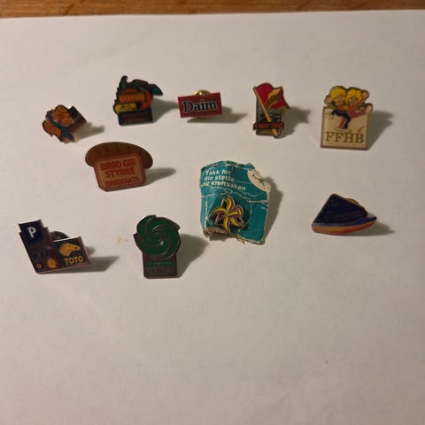 Samling av diverse pins og merker
