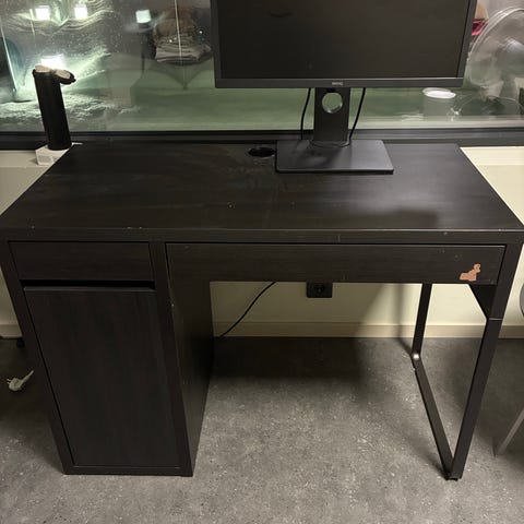 Fint skrivebord med hjørneløsning. Størrelse på hjørneenhet er 125 cm. Beina kan justeres med å skru ca 10 cm. Demontert.