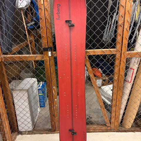 Selger pakke med splitboard, bindinger, topptursko til splitboard, feller, kit med ekstra deler til brettet og snowboard bag.