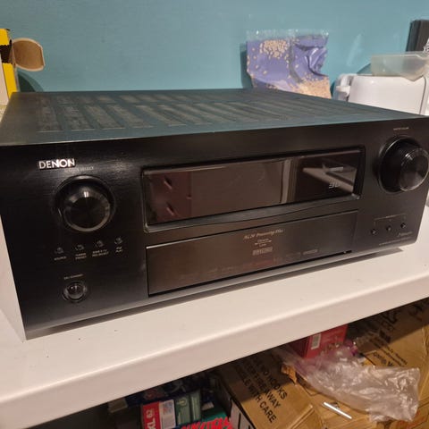 Denon AVR-4311 Surround Receiver med støtte for HDMI-tilkobling. Enheten har en frontpanel med display som viser tilkoblingsstatus og volum. Egnet for hjemmeunderholdningssystemer.
