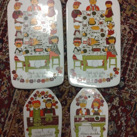Smørskål med lokk og smørfat, begge med motiv Norge