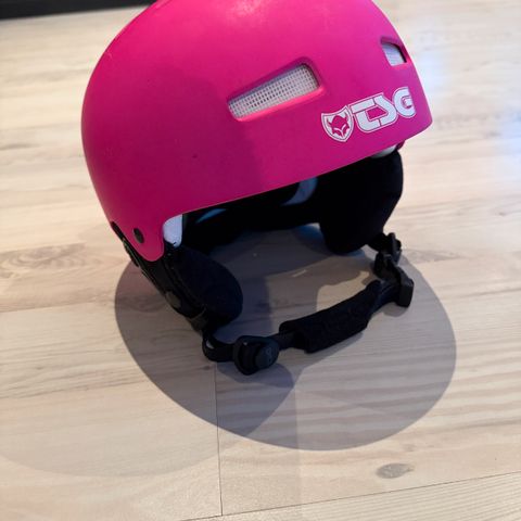 TSG hjelm i størrelse L/XL, svart farge. Hjelmen har ventilasjonshull og justerbar stropp for sikker passform. Egnet for beskyttelse ved aktiviteter som krever hodebeskyttelse.