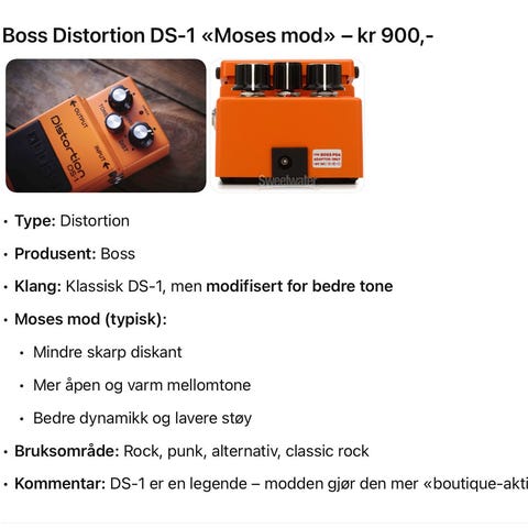 Distortion, boost og overdrive i plassbesparende pedal. Låter virkelig bra og ruller fint av volume på gitaren til, veldig dynamisk.