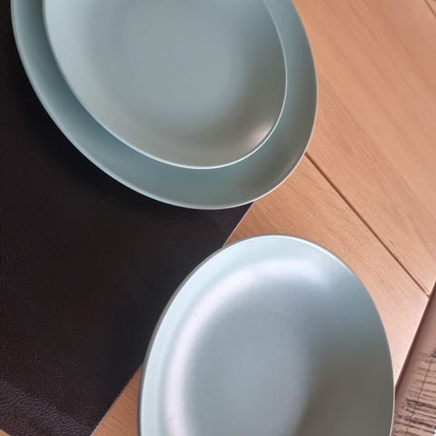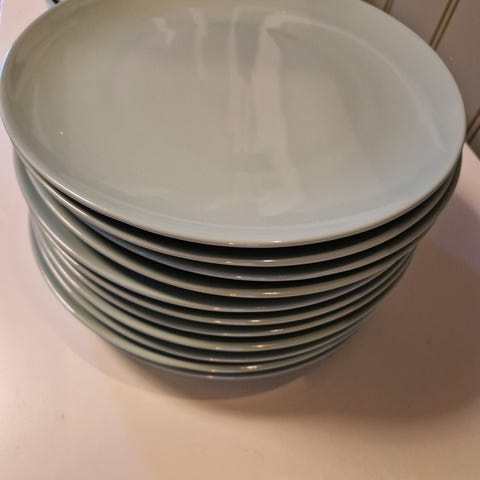 Det er 11stk store tallerkner, 11stk små tallerkner, 5 stk krus og 8 stk boller