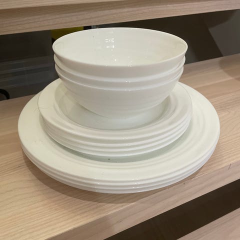IKEA servise sett som inkluderer tallerkener, en bolle og en kopp. Produktene har en nøytral farge og et enkelt design. Serviset er laget for daglig bruk i kjøkken og spisestue.