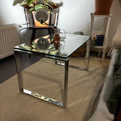 Godt brukt stuebord his bort mot henting. Praktiske hyller og ein skuff, samt at det er på hjul og er enkelt å flytte rundt på. Glasplate på toppen. Merker og slitasje, vi har brukt duk over.