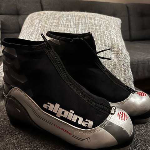 Alpina skisko i hvit farge. Skiskoene har glidelås foran og borrelås over ankel for justering og støtte. Yttersålen har mønster for grep. Materialet er syntetisk med forsterkninger ved hæl og ankel.