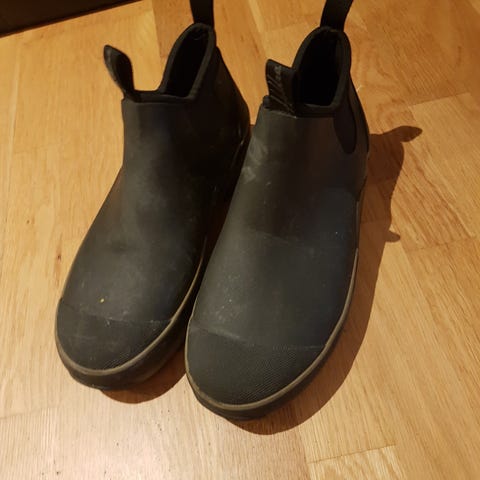 Duckfeet vinterstøvler. Egentlig str 44, men byttet såle og reparerte skinnet over vristen hos skomaker i fjor og da ble de litt for trange for meg. Så anslår de er mer som 43.