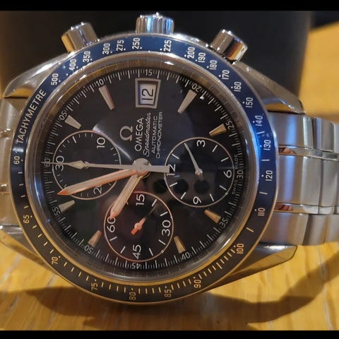 Omega Speedmaster Date Ref. 3521.80 med dyp blå skive fra 1993. Klokken fremstår som pen og er i generelt god stand. Referanseverdi på ca. +9 sek i timegrapher, som er godt innenfor for vintage klokker. Klokken kommer med ukjent servicehistorikk, og består kun av orginaldeler.