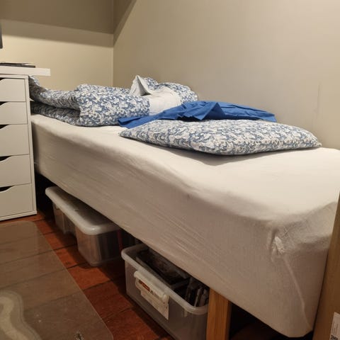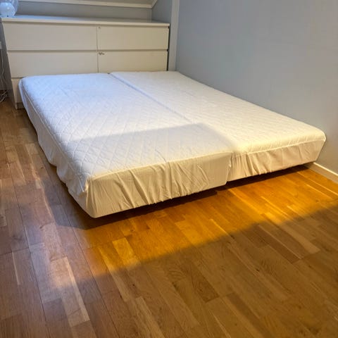 Sengen/rammemadrassen er pent brukt, med normale bruksspor, men fortsatt komfortabel og solid.