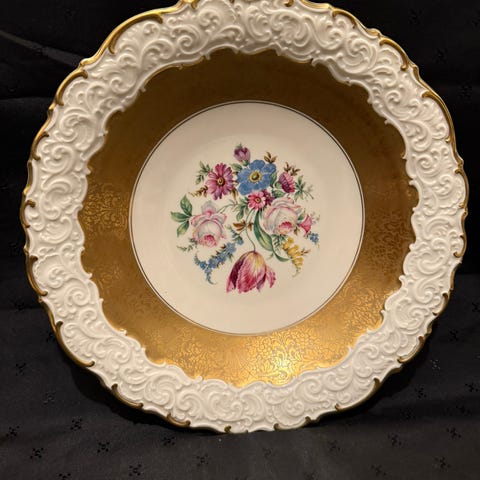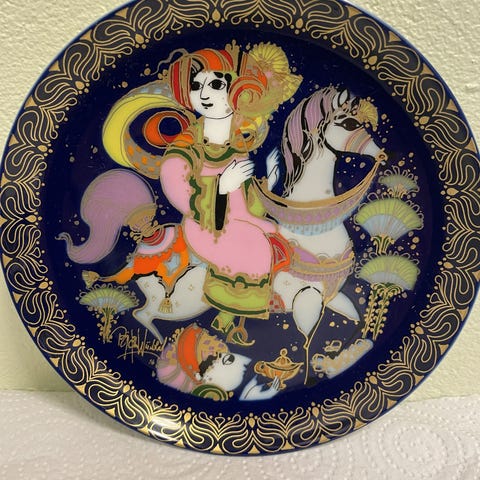 Rosenthal Studio-line Aladdin und die Wunderlampe 1 - dekorativt fat med fargerikt motiv. Fatet har et detaljert design som illustrerer Aladdin og den magiske lampen. Laget av porselen, egnet for dekorasjon. Har oppheng på baksiden.