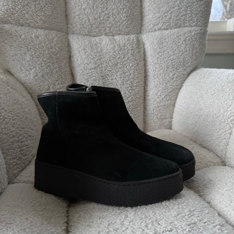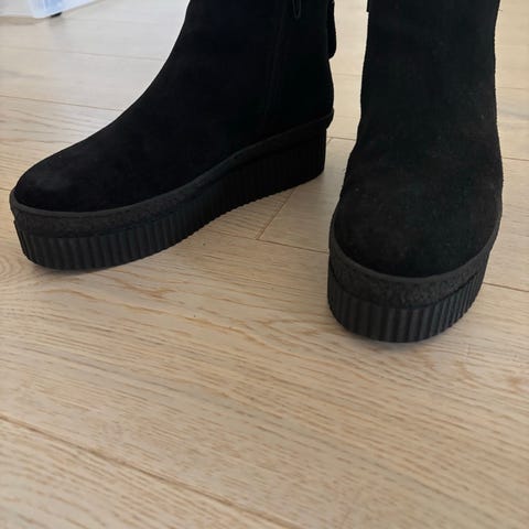 Pent brukte vinterstøvler fra Nude of Scandinavia, svart semsket skinn, lammeskinnsforet, str 41. Glidelås i siden. Selges kr 700.