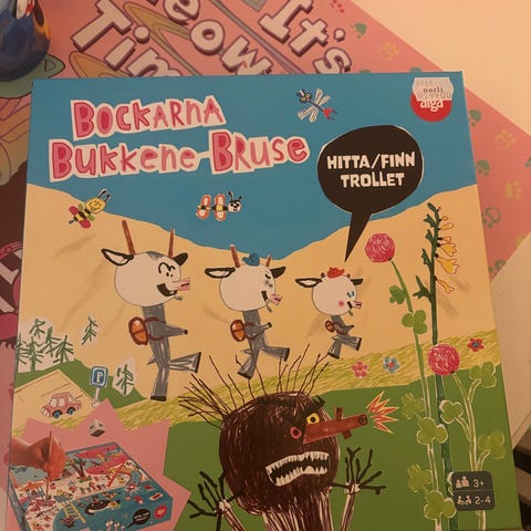 Alga Bukkene Bruse brettspill med fargerikt design og illustrasjoner. Spillet er basert på eventyret om Bukkene Bruse og inneholder brettspillkomponenter tilpasset barn.