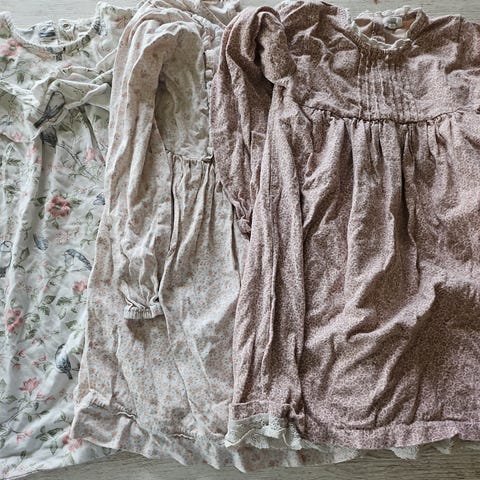 Newbie klær for jente i størrelse 122 med flere plagg i ulike farger og materialer. Inneholder blant annet langermede topper i rosa og brun, samt bukser i forskjellige farger og mønstre. Passer for barn i denne aldersgruppen.