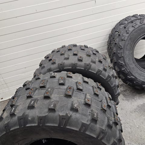 Gamle, men fortsatt brukbare. Kjørt forholdsvis lite, lagret kalt/mørkt. Noe lakkflassing. Mønsterdybde fra ca 6-9mm. Pigger sitter fortsatt godt.